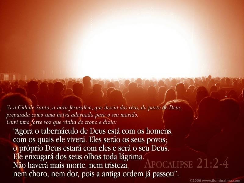 Vi a Cidade Santa, a nova Jerusalém, que descia dos céus, da parte de Deus, preparada como uma noiva adornada para o seu marido. Ouvi uma forte voz que vinha do trono e dizia: “Agora o tabernáculo de Deus está com os homens, com os quais ele viverá. Eles serão os seus povos; o próprio Deus estará com eles e será o seu Deus. Ele enxugará dos seus olhos toda lágrima. Não haverá mais morte, nem tristeza, nem choro, nem dor, pois a antiga ordem já passou”. Apocalipse 21:2-4
